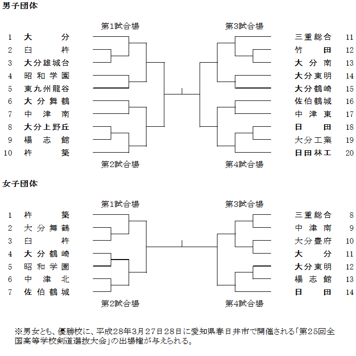 ※男女とも、優勝校に、平成28年3月27日28日に愛知県春日井市で開催される「第25回全国高等学校剣道選抜大会」の出場権が与えられる。
